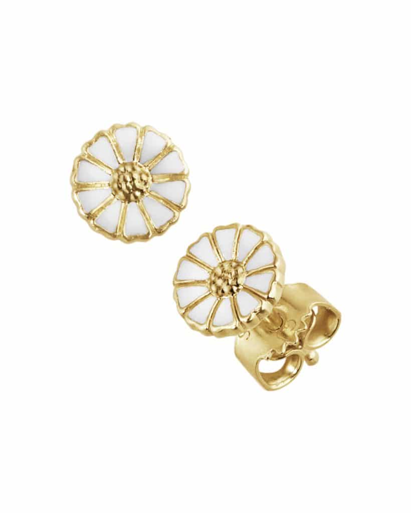 7mm Daisy Ørepynten er laget av sterlingsølv og er belagt med 18kt. gull og håndmalt med hvit emalje.