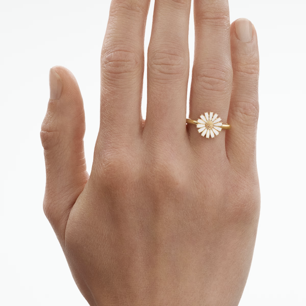 Denne blomstrende Daisy ringen i 18 kt. forgylt sterlingsølv med hvit håndmalt emalje representerer en av Georg Jensens mest ikoniske smykkekolleksjoner. Daisy-ringen er laget i sterlingsølv med håndmalt emalje og bærer en litt endret versjon av det opprinnelige motivet. Ringen gjenspeiler Georg Jensens designarv og er samtidig et allsidig og moderne smykke til hverdagsbruk.