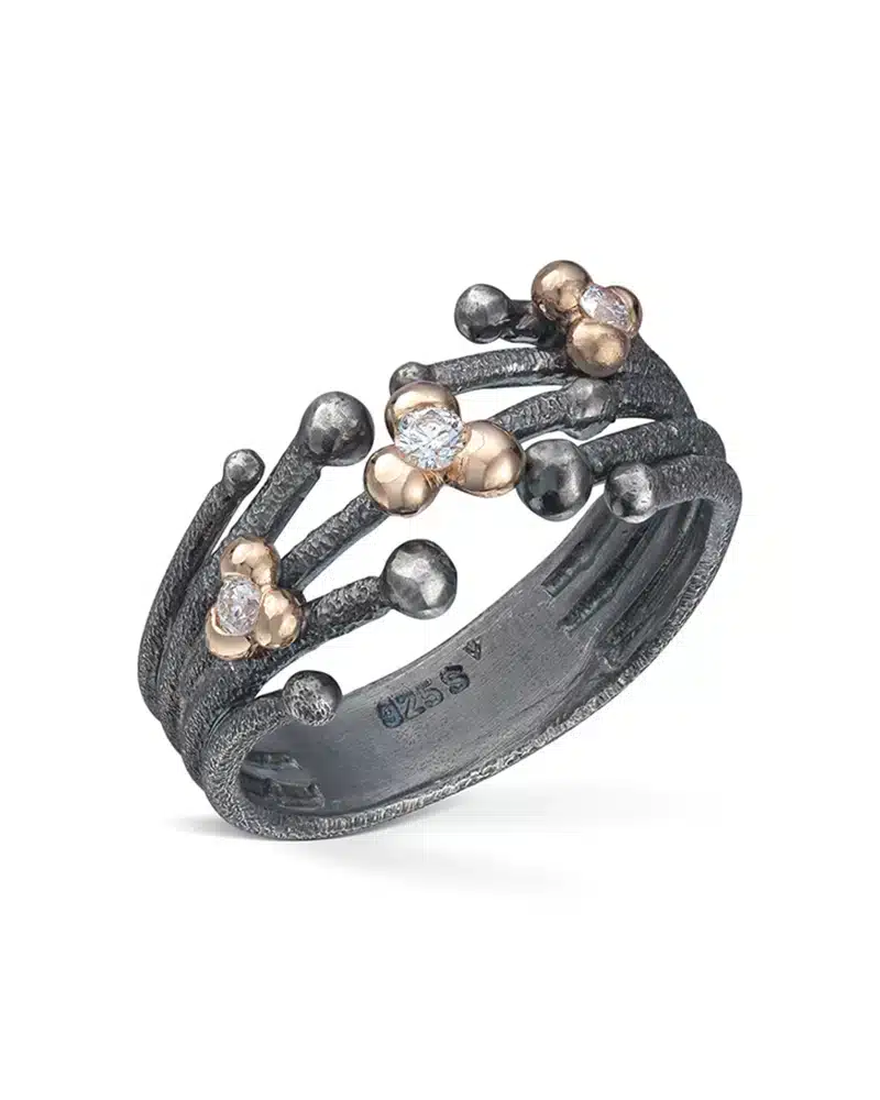Dugg – Oksidert sølvring med gull og diamanter