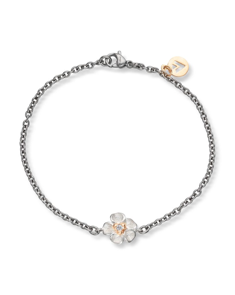 Dette lekre Flôra-armbåndet kombinerer robust stål med sølv og varmt gult gull i et lite, elegant blomsterdesign. Midt i blomsten sitter en diamant på 0,03 ct TW/SI som gir et subtilt glimt av luksus. Den delikate blomsten måler 1 cm og gir armbåndet et feminint og tidløst uttrykk. Et stilrent smykke som passer perfekt både alene eller kombinert med andre favoritter.