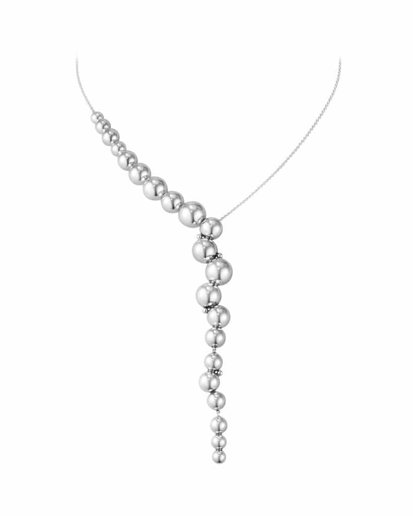 En rekke sterlingsølvperler følger halsen som om den vokser naturlig frem, før den avsluttes i en drueklase og danner denne elegante halskjeden. Perlene langs kjeden står ikke fast, og anhenget er laget av separate leddede seksjoner, noe som bidrar til en følelse av flyt i designen og en komfortabel passform rundt halsen. Brukes med matchende øredobber fra samme kolleksjon for en sofistikert kveldslook.