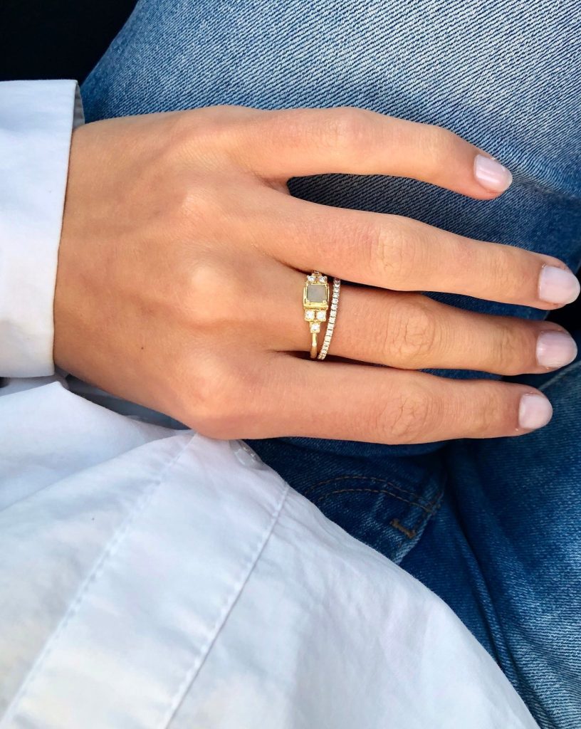 Denne ringen symboliserer moderne enkelhet og den unike, naturlige skjønnheten i grå diamanter. Ringen er nydelig utformet i 18 karat gult gull, satt med en bordslipt grå diamant på 0,40 ct (Grey P1) og en prinsesseslipte hvite diamanter på 0,15 ct TW.VS. Som en signaturdetalj er den også prydet med Ro Copenhagen sin briljantslipte diamant på 0,003 ct TW.VS.