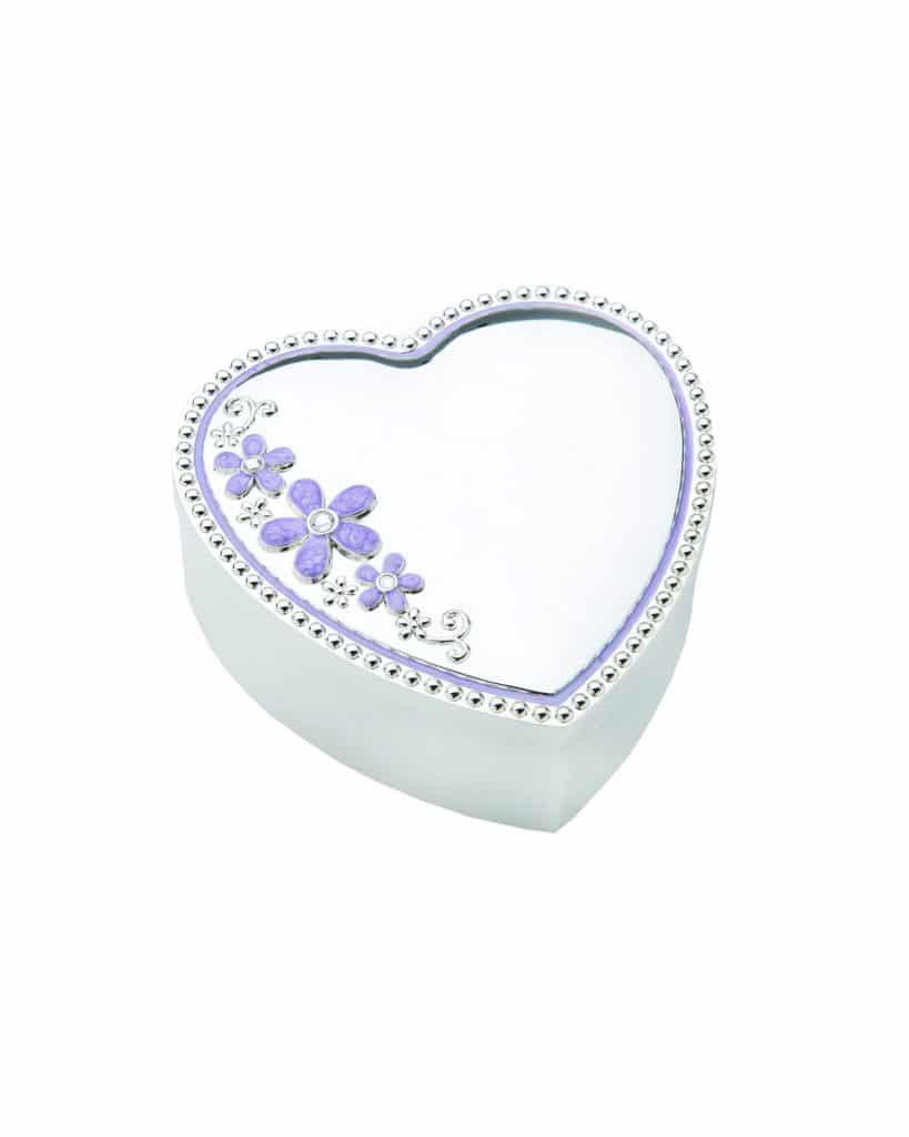 Smykkeskrin dekorert med lilla blomster.